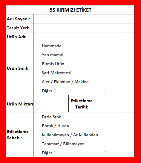 Ayıklama esnasında kullanılacak ve kullanılmayacak parçalar kırmızı etiket tekniği ile birbirinden ayrılmalı. Daha sonra kırmızı etiketli malzemelere ne olacağını sorgulayıp kayıt altına alacağız.